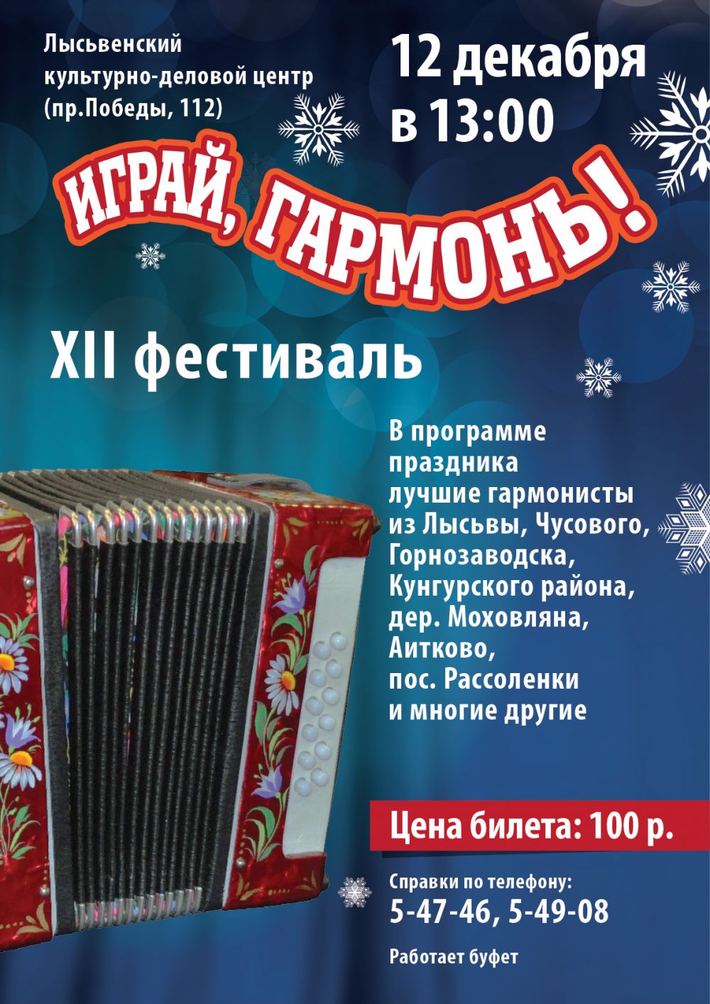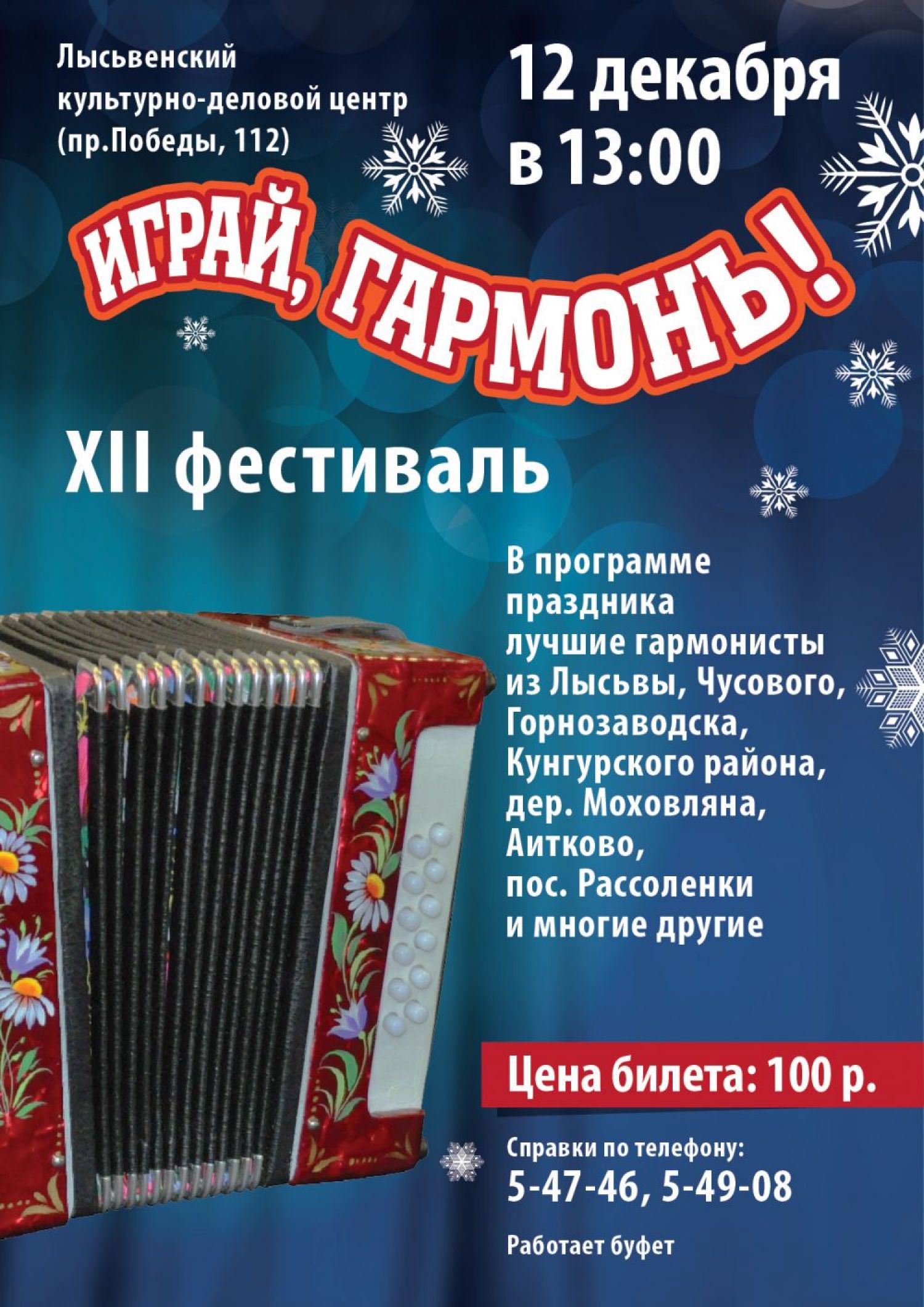 Лысьвенский культурно-деловой центр приглашает вас на фестиваль «Играй, гармонь!» 12 декабря в 13-00 часов.