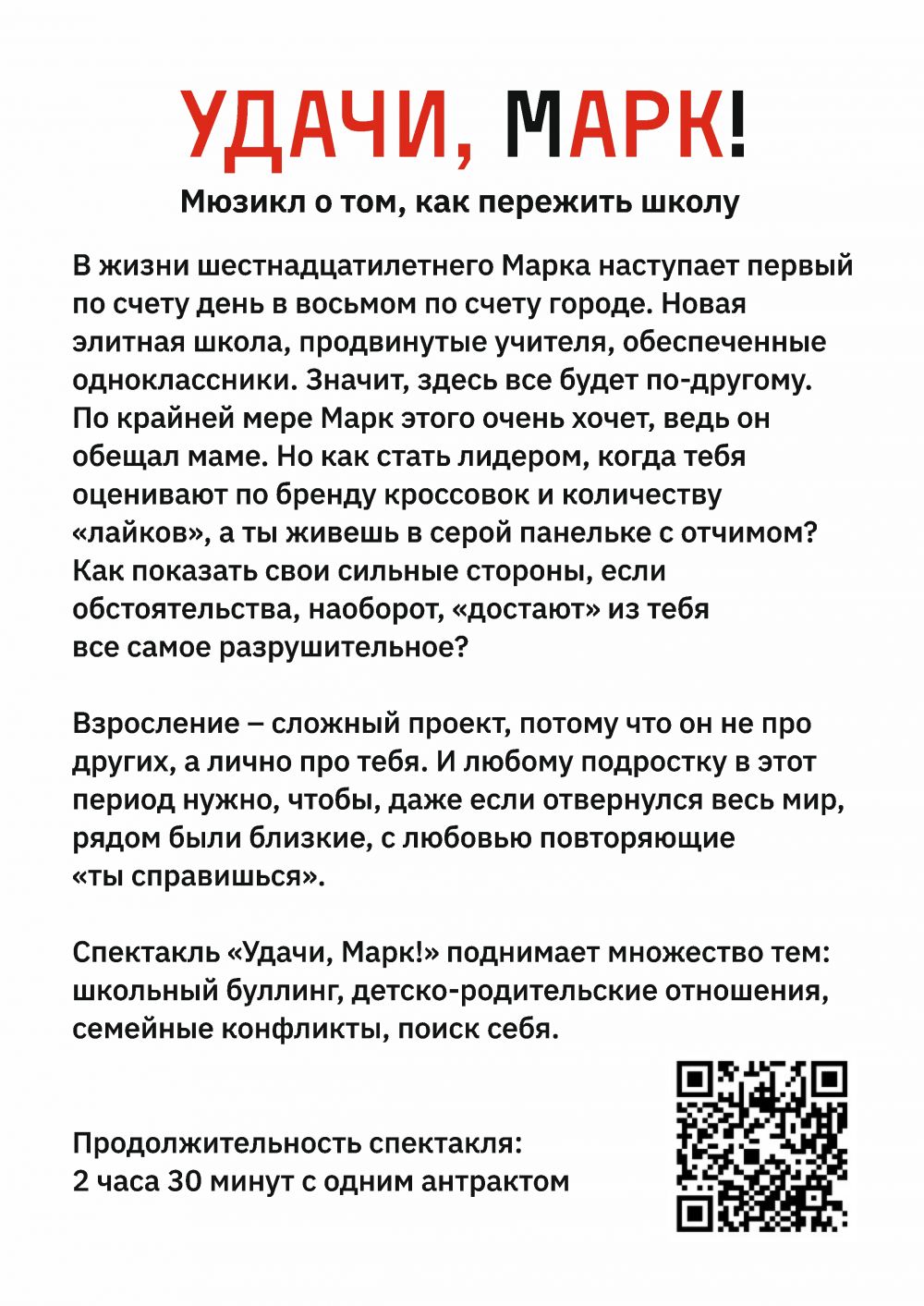 Спектакль «Удачи, Марк!» поднимает множество тем: школьный буллинг, детско-родительские отношения, семейные конфликты, поиск себя.