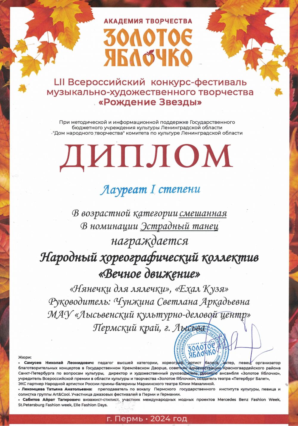 НХК «Вечное движение» стали Лауреатами I степени и обладателями ГРАН-ПРИ Всероссийского конкурса-фестиваля музыкально-художественного творчества «Рождение Звезды», который проходил в Перми 23 ноября/