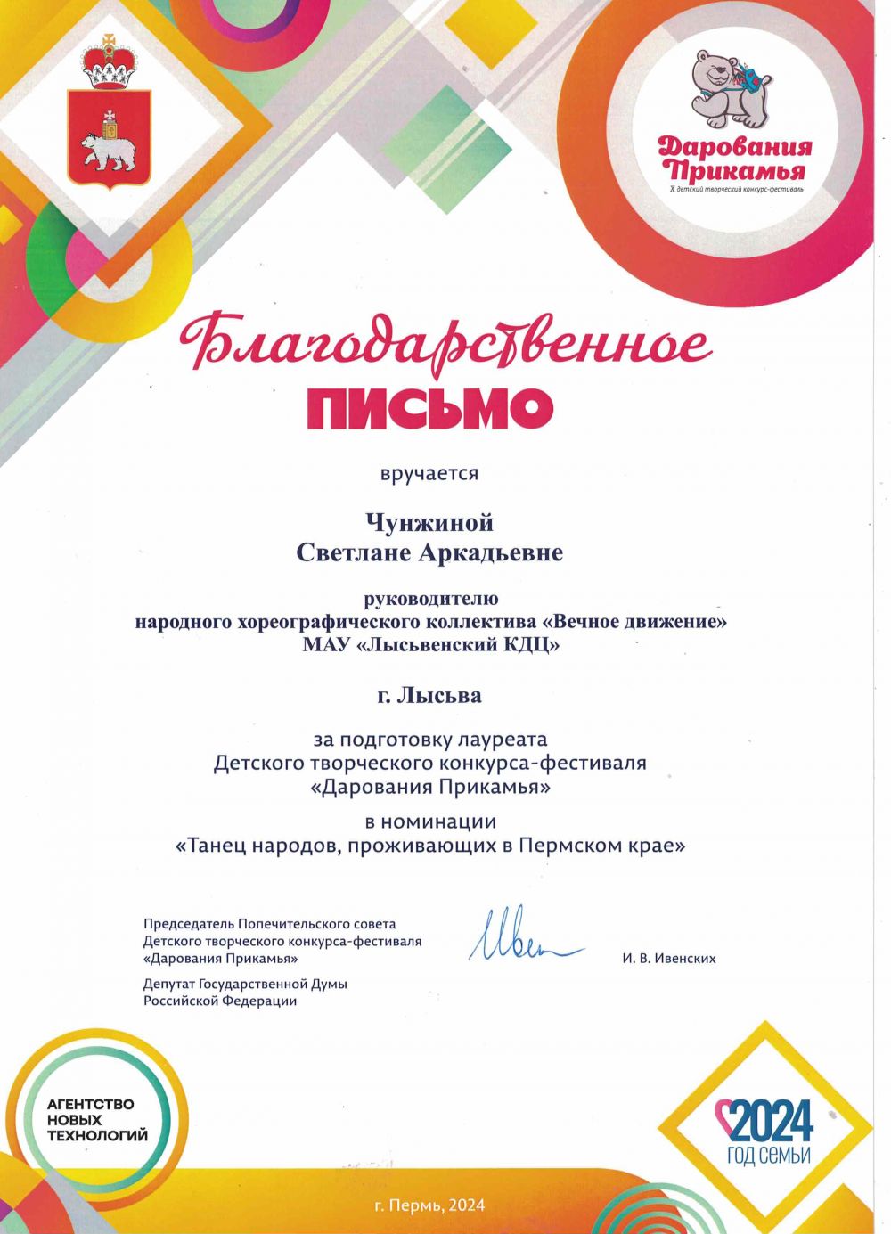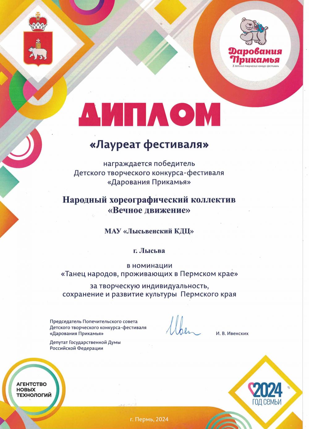 В списке отличившихся участников конкурса наш Народный хореографический коллектив «Вечное движение» (руководитель Светлана Аркадьевна Чунжина), который второй год подряд становится лауреатом в номинации «Танец народов, проживающих в Пермском крае».