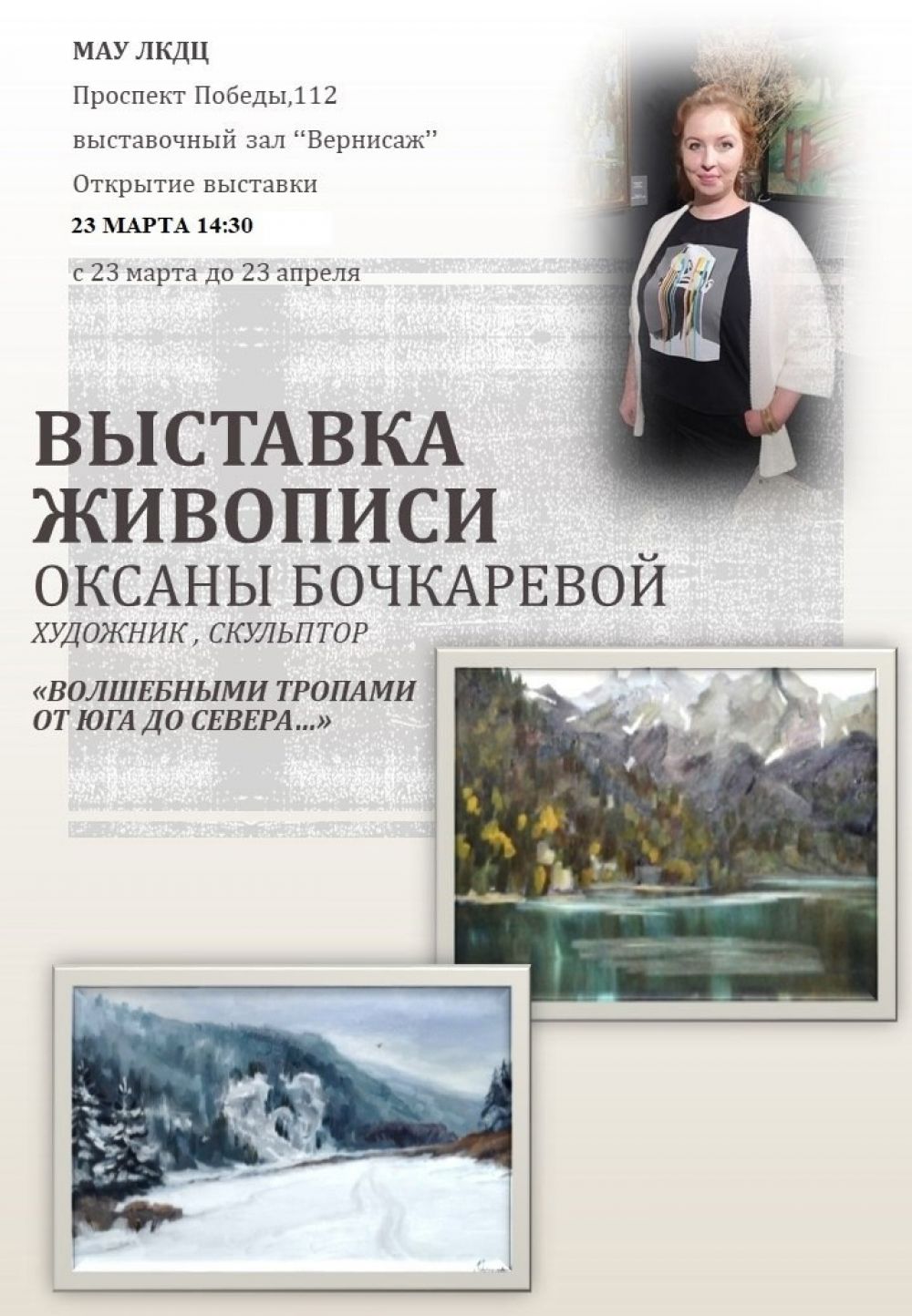 — Экспозиция живописи Оксаны Бочкарёвой (г. Чусовой-г.Кунгур) "Волшебными тропами от юга до севера..." (арт-фойе второго этажа около малого зала).