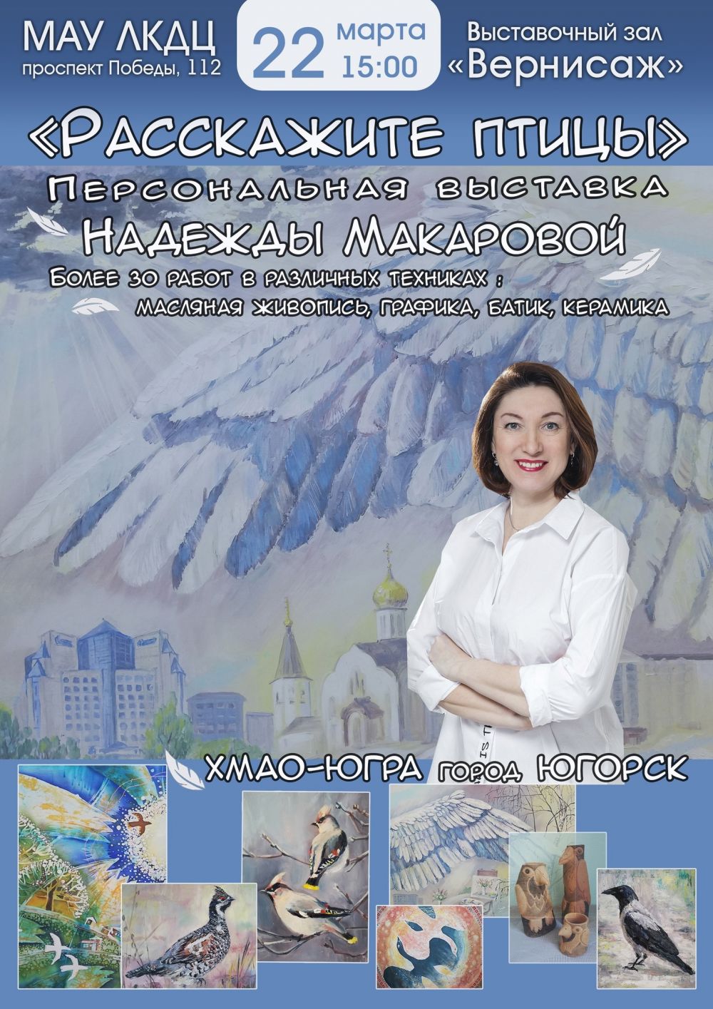 — Персональная экспозиция Надежды Макаровой (г. Югорск) «Расскажите птицы» (живопись, графика, батик, керамика), расположенная в выставочном зале «Вернисаж».