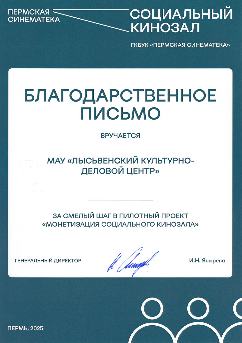 Социальные кинозалы Лысьвенского культурно-делового центра отметили благодарственными письмами за успешное внедрение платных показов и эффективную работу в этом направлении, а также за системное повышение квалификации сотрудников.