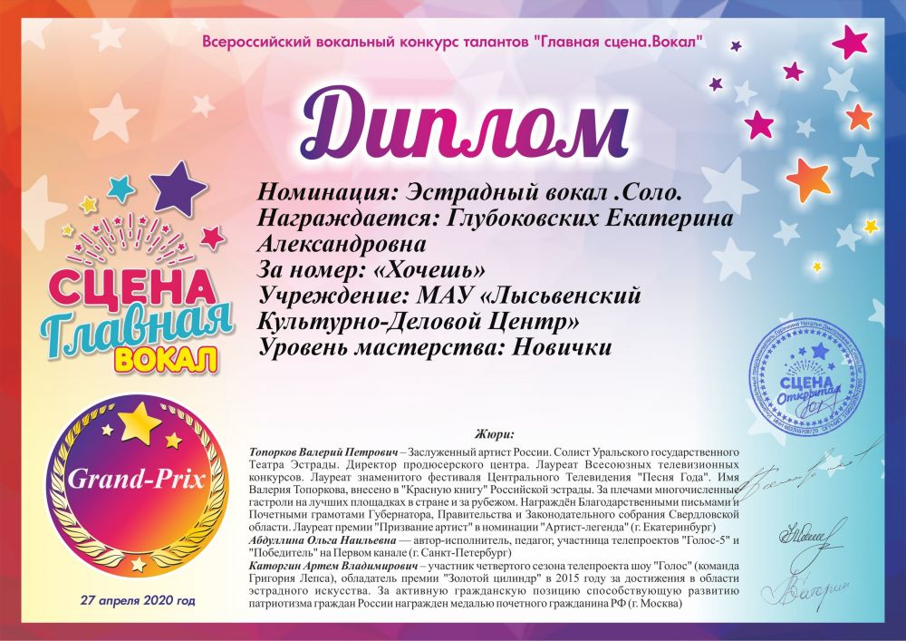 Екатерина Глубоковских приняла участие во Всероссийском вокальном конкурсе талантов «Главная сцена. Вокал», который проходил с 22 по 26 апреля, в режиме онлайн.