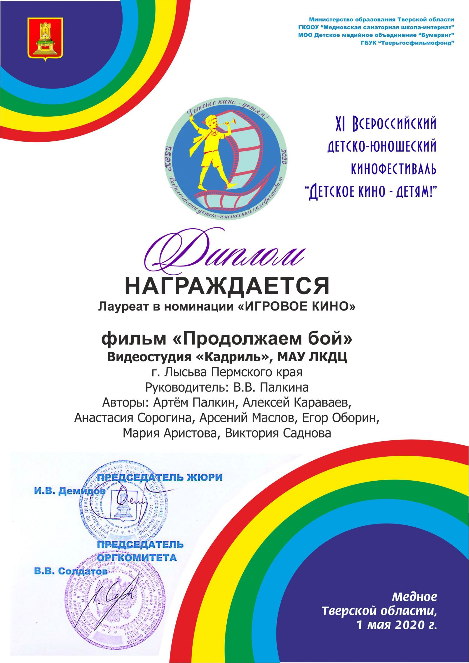К сожалению, в этом году такой тёплой встречи по понятным причинам не было, но наша студия, как и многие другие, приняла участие заочно. И вот пришли результаты. Наш новый фильм «Продолжаем бой» стал... (та-да-дам!!!) лучшим игровым фильмов фестиваля. Кроме этого, наш социальный ролик «Жвачка» был отмечен дипломом детского жюри.
