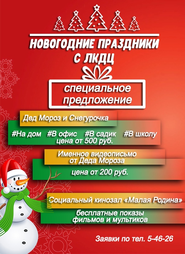Предлагаем вызвать новогодних волшебников и в трудовой коллектив. Праздничную оперативку или совещание украсят поздравления и, конечно, подарки, приготовленные руководством коллектива. Фотосессия с Дедушкой Морозом и Снегурочкой дополнит впечатления этого дня. Стоимость приезда в офис – от 1500 рублей.