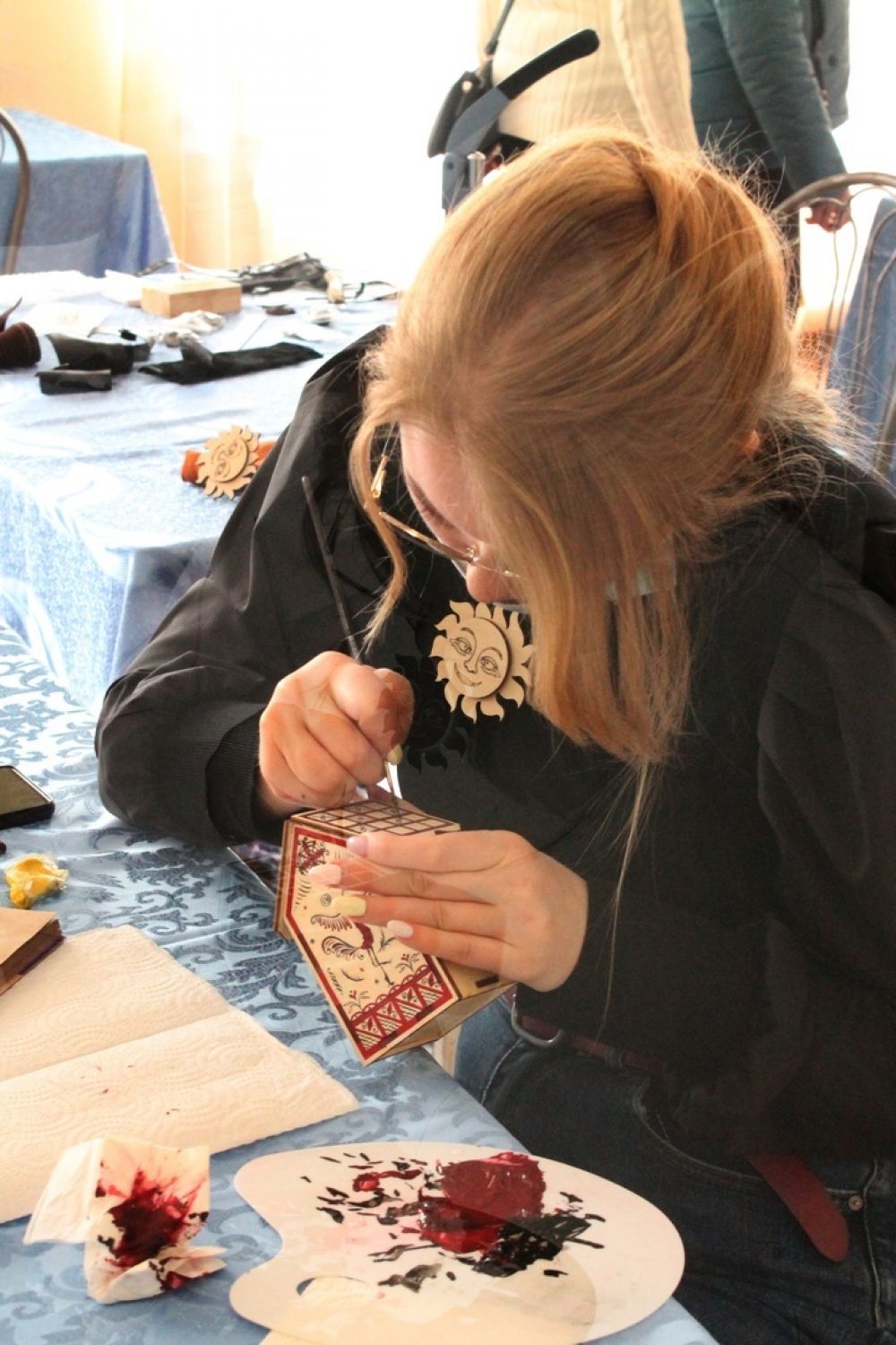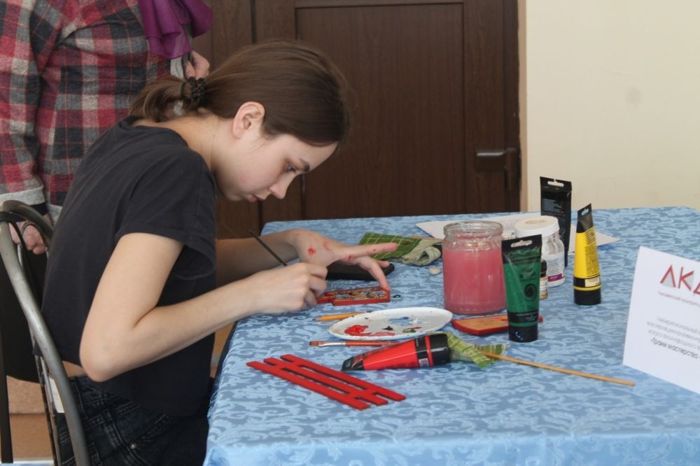 Наталья Харатян расписывала мини-скворечник мезенской росписью, а Татьяна Бычкова – мини-набор из досочек традиционной городецкой росписью. Поистине ювелирная работа обеих девушек завораживала внимание зрителей!