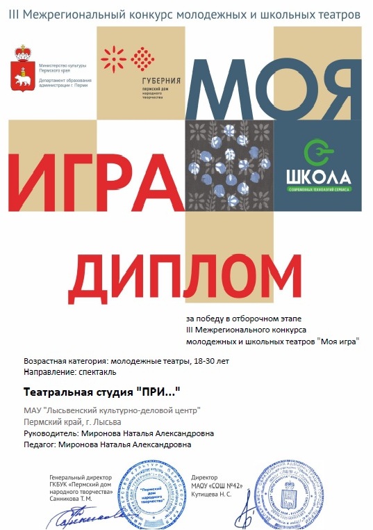 В сентябре театральная студия «ПРИ» под руководством Натальи Мироновой стали участником III Международного конкурса молодежных и школьных театров «Моя игра». Заслуженную победу и диплом получил коллектив студии за спектакль «Мой бедный Марат — начало истории».
