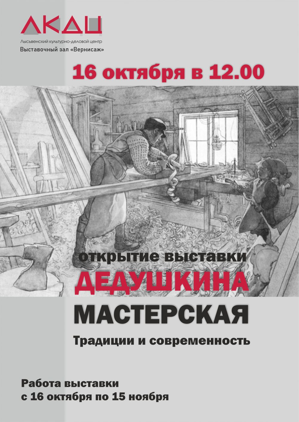 В выставочном зале «Вернисаж» Открытие выставки «Дедушкина мастерская. Традиции и современность» Работа выставки с 16 октября по 15 ноября.