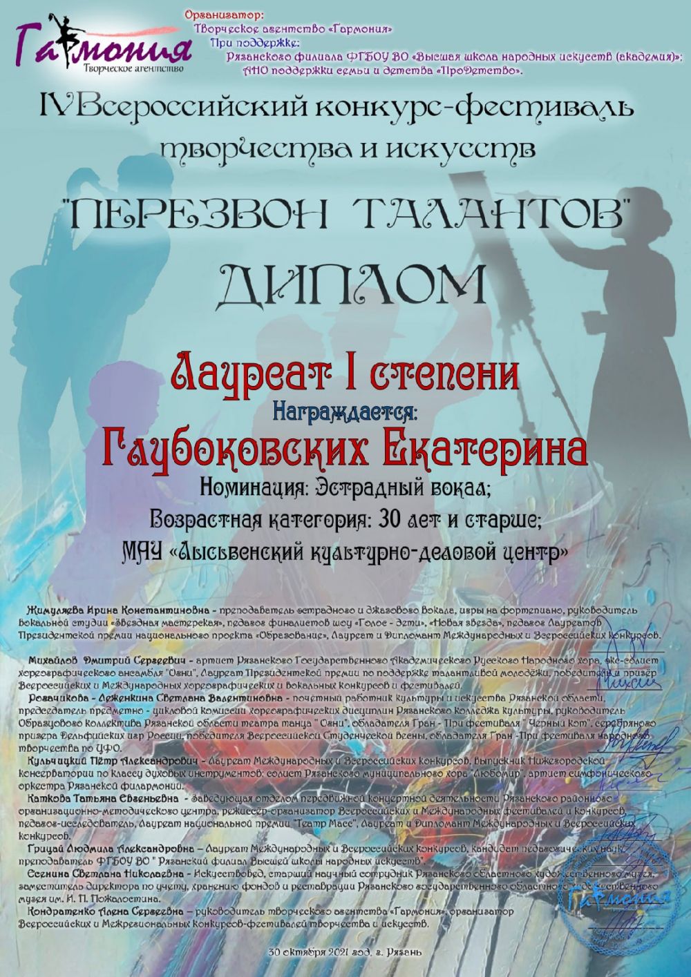 На IV Всероссийском конкурсе-фестивале творчества и искусств «Перезвон талантов» Екатерина Глубоковских получила высокую оценку членов жюри — Лауреат 1 степени за исполнение песни-романса «Ты не целуй».