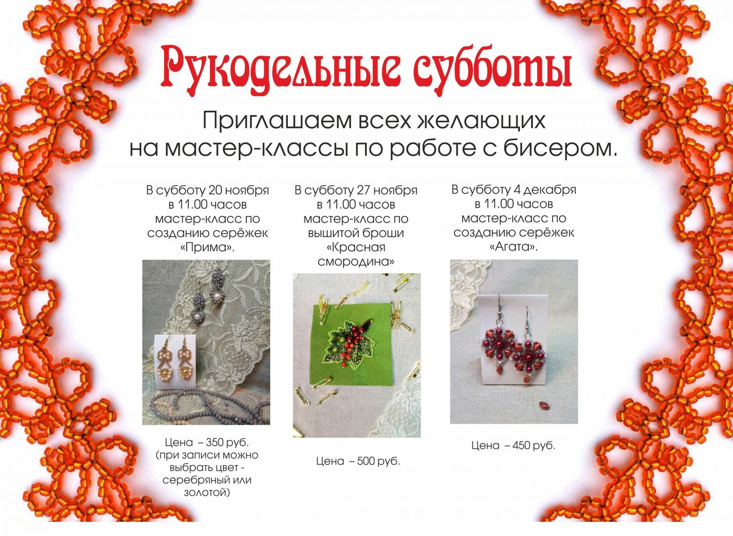 Мастер-классы будут проходить в хорошо освещённом помещении под руководством опытного мастера по работе с бисером Галины Михайловой.