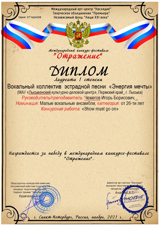 Вокальный коллектив эстрадной песни «Энергия мечты», руководитель Игорь Чежегов, получили диплом Лауреата 1 степени за исполнение номера «Show must go on» в номинации «Малые вокальные ансамбли» категории от 26 лет.