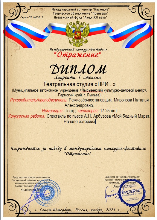Спектакль по пьесе Н. А. Арбузова «Мой бедный Марат. Начало истории» Театральная студия «ПРИ…», руководитель Наталья Миронова, получил диплом Лауреата 1 степени международного конкурса-фестиваля «Отражение» в номинации «Театр», категории от 17-25 лет.