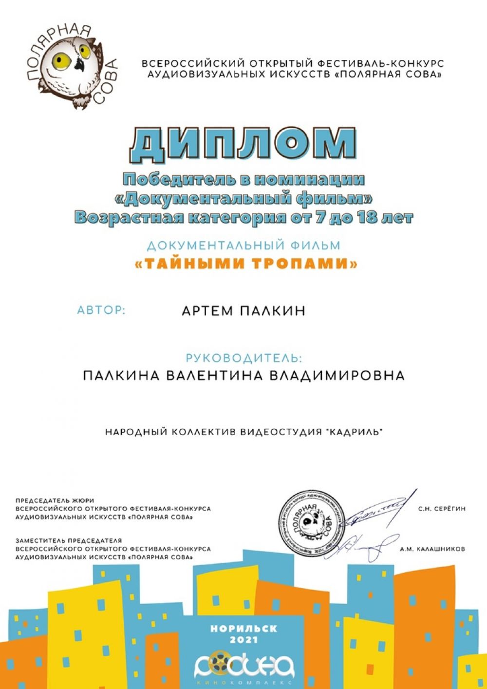 В заполярном Норильске подведены итоги Всероссийского открытого фестиваля-конкурса аудиовизуальных искусств «Полярная Сова — 2021». Лысьву представлял народный коллектив видеостудия «Кадриль», работающий в МАУ «ЛКДЦ». Коллектив отправил на конкурс три видеоработы: телерепортаж «Молоко», игровой фильм "Продолжаем бой!" и документальный фильм «Тайными тропами». И вот, наконец, профессиональное жюри Фестиваля-конкурса определило победителей в различных номинациях. Две наши первые работы отмечены дипломами участника, а фильм «Тайными тропами» — та-дам! — стал победителем в номинации «Документальный фильм»!