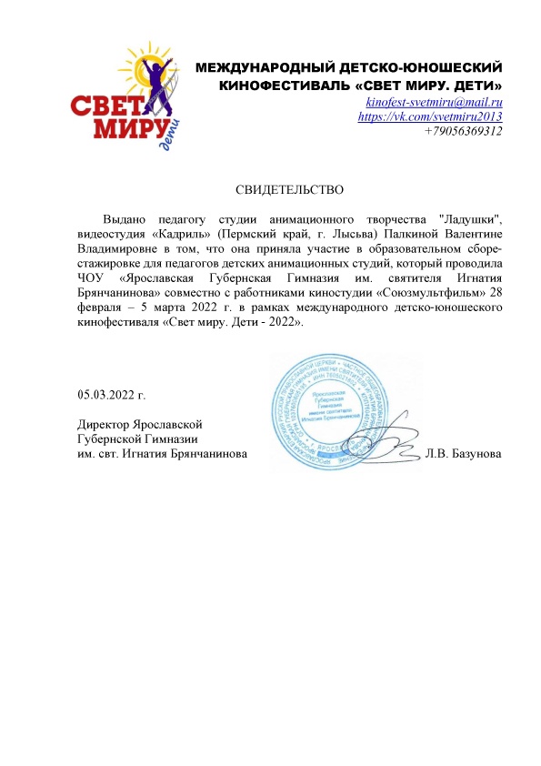 С 27 февраля по 6 марта руководитель народного коллектива видеостудия «Кадриль» и студии анимационного творчества «Ладушки» Валентина Палкина побывала на стажировке «Просто анимация», которая проводилась в Ярославле. Участники стажировки съехались со всей России: Тюмень, Екатеринбург, Кострома, Пермь, Глазов, Липецк, Киров, Москва, Кемерово, Нижний Новогород, Башкортостан. Стажировку вели опытные педагоги-аниматоры «Союзмультфильма» Алла Соловьёва и Сергей Струсовский. Кроме насыщенной и очень важной программы обучения, организаторы подарили участникам посещение села Вятского. Надо сказать, что Вятское признано самым красивым селом России. В рамках стажировки педагоги-аниматоры сделали анимационную заставку для Международного фестиваля «Свет миру»