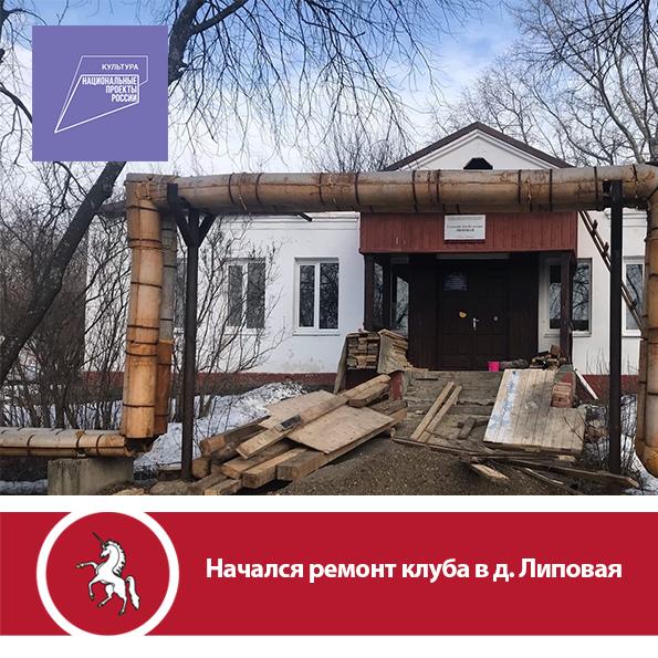 На обеспечение развития и укрепления материально-технической базы домов культуры в населенных пунктах с числом жителей до 50 тысяч человек, в рамках, реализации федерального Партийного проекта Единой России — «Культура малой Родины» (местный дом культуры) в 2022 году принимает участие структурное подразделение МАУ «ЛКДЦ» — сельский дом культуры «Липовая».