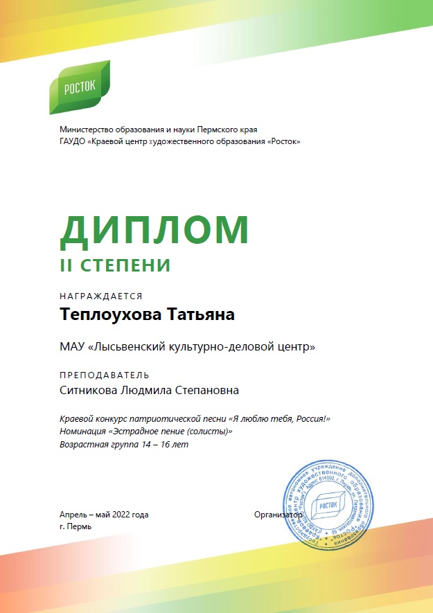 Татьяна Теплоухова в номинации «Эстрадное пение (солисты)» возрастной группы 14 – 16 лет награждена Дипломом II степени.