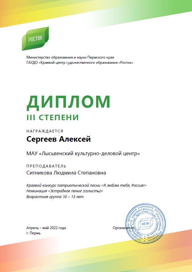 Алексей Сергеев в номинации «Эстрадное пение (солисты)» возрастной группы 10 – 13 лет награжден Дипломом III степени.