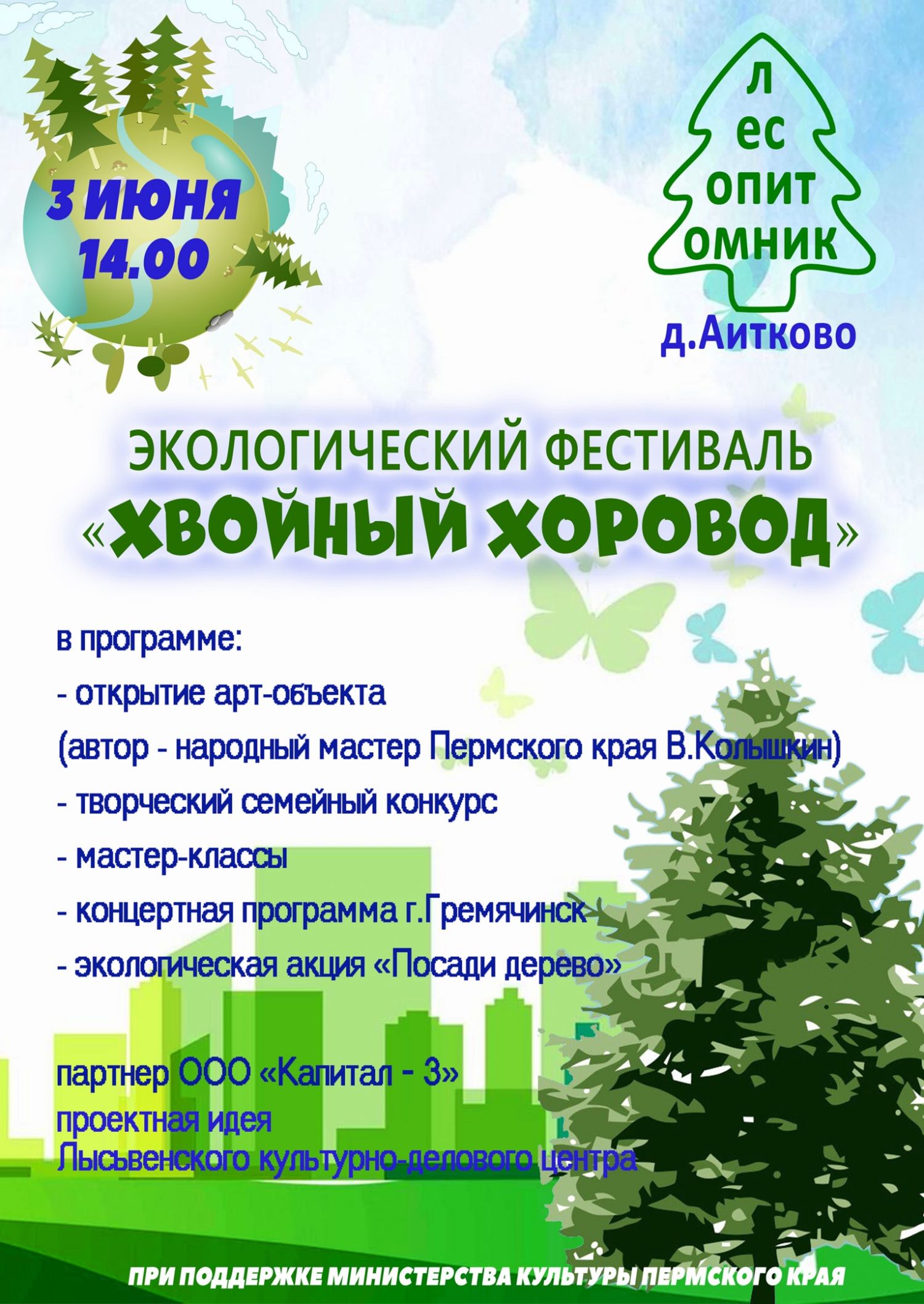 3 июня 2022 года свершилось это грандиозное событие – экологический фестиваль «Хвойный хоровод» — победитель краевого проекта «Творческие люди» на территории питомника Гремячинского деревообрабатывающего комбината в деревне Аитково при поддержке Министерства культуры Пермского края, Пермского дома народного творчества «Губерния», ООО «Капитал – 3». Открыл фестиваль глава Лысьвенского городского округа Никита Федосеев.