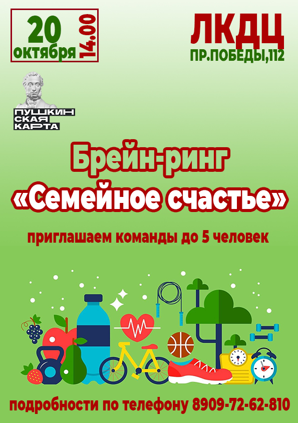 20 октября Лысьвенский культурно-деловой центр приглашает вас принять участие в увлекательной, познавательной игре – брейн-ринге «Семейное счастье»! Ждем команды не менее 5 человек — это могут быть друзья-приятели, одноклассники – однокурсники, соседи-коллеги!!! Задания игры будут интересными и несложными!
