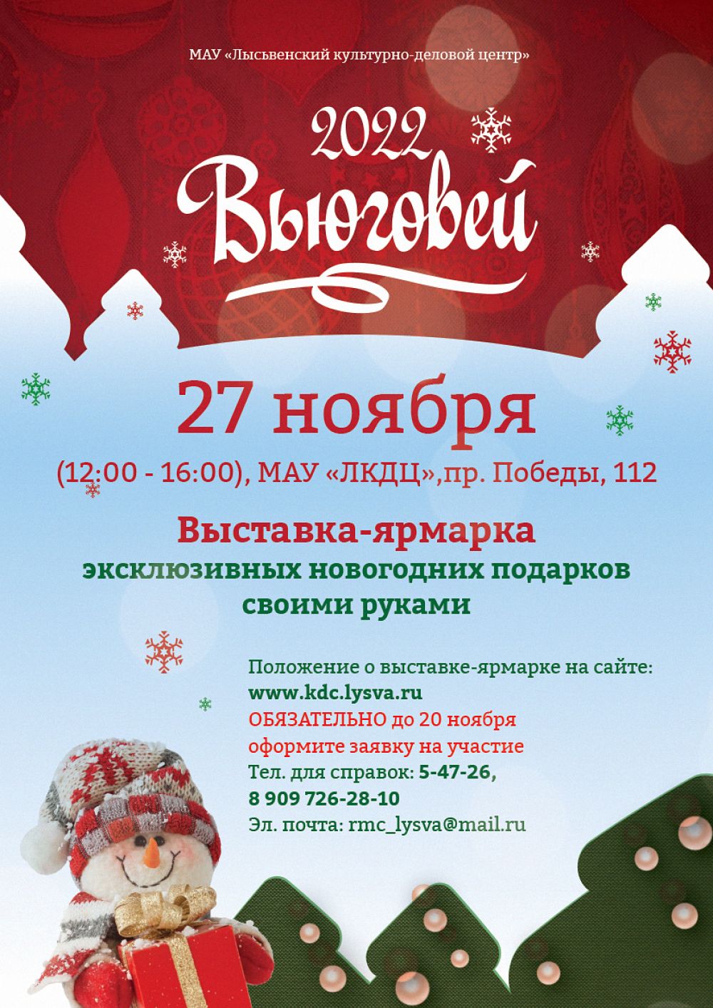 В ожидании праздника «Вьюговей»! Мастера и мастерицы, рукодельницы и умельцы приглашаем вас к участию в традиционной выставке-ярмарке «Вьюговей – 2022», которая состоится 27 ноября! Ваши изысканные работы, рукотворные подарки и сувениры к новогодним праздникам пользуются большим успехом у лысьвенцев. Взнос за участие в фестивале 500 рублей.