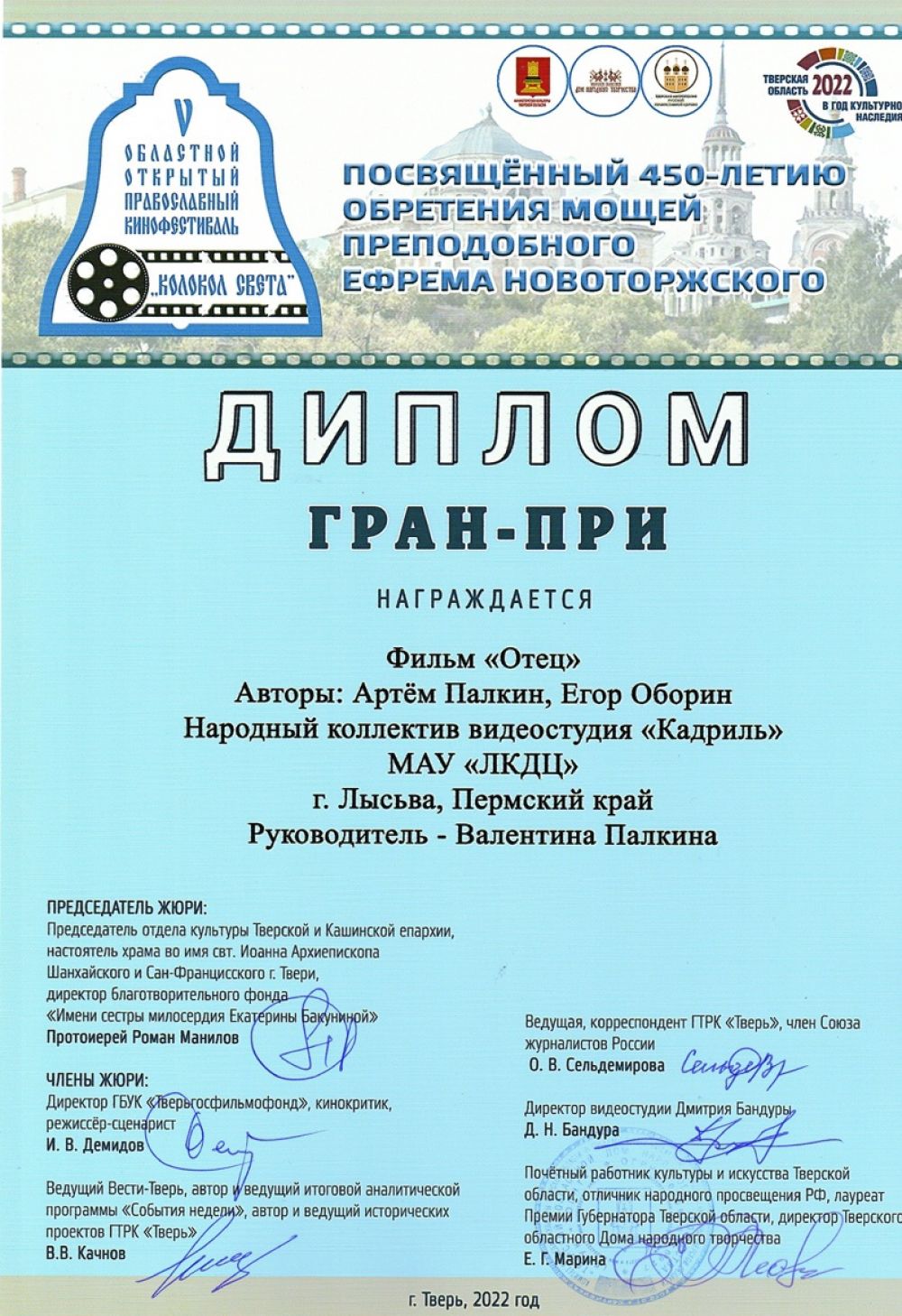 И очень приятно, что жюри под председательством протоиерея Романа Манилова, председателя отдела культуры Тверской и Кашинской епархии, настоятеля храма во имя свт. Иоанна Архиепископа Шанхайского и Сан-Францисского г. Твери, директора благотворительного фонда «Имени сестры милосердия Екатерины Бакуниной», отдало пальму первенства нашей киноработе. Гран-при фестиваля «Колокол света» получил фильм «Отец», созданный видеостудией «Кадриль» в нынешнем году.