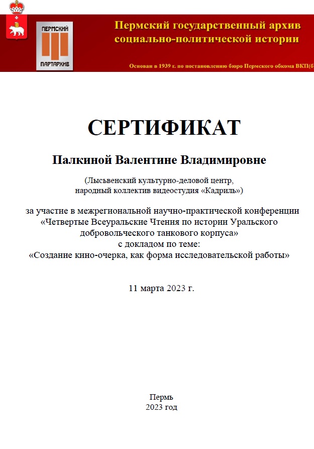 Воспитанники народного коллектива видеостудия «Кадриль» Лысьвенского культурно-делового центра Татьяна Самосадкина и Егор Оборин под руководством Валентины Владимировны Палкиной впервые участвовали в Чтениях. На этом торжественном и очень значимом мероприятии «Кадриль» представила исследовательскую видеоработу с рабочим названием «Вместо танков – мотоциклы». Сей новый документальный проект видеостудии повествует зрителям про мотопробег, который организовали лысьвенцы-металлурги в 1975 году, к 30-летнему юбилею Победы, по маршруту боевого пути славного УДТК. А снят фильм был по инициативе Ольги Викторовны Кожевниковой, заместителя начальника отдела научно-публикаторской деятельности ПермГАСПИ.