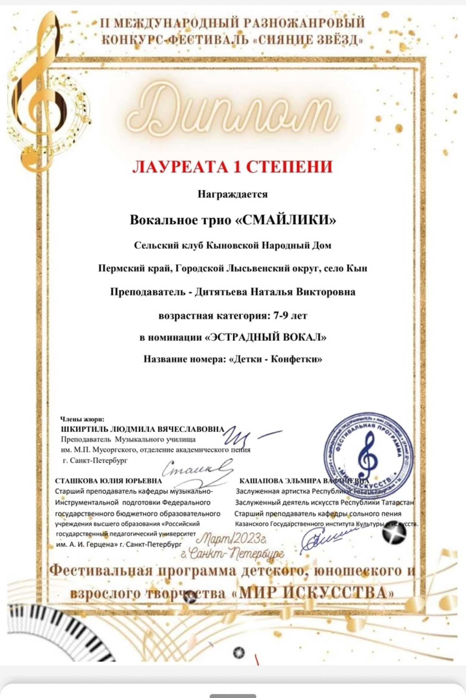 Лауреатом 1 степени стало вокальное трио «Смайлики» (преподаватель Дитятьева Н. В.) в возрастной категории 7-9 лет, номинации «Эстрадный вокал» с номером «Детки – конфетки»,