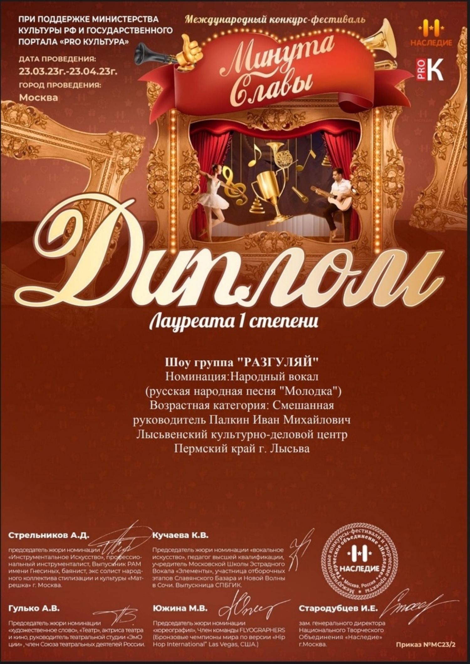 В середине марта Шоу группа «РАЗГУЛЯЙ» приняла участие в международном конкурсе-фестивале «Минута славы» г. Москва. При поддержке Министерства культуры РФ. и государственного портала Про культура.