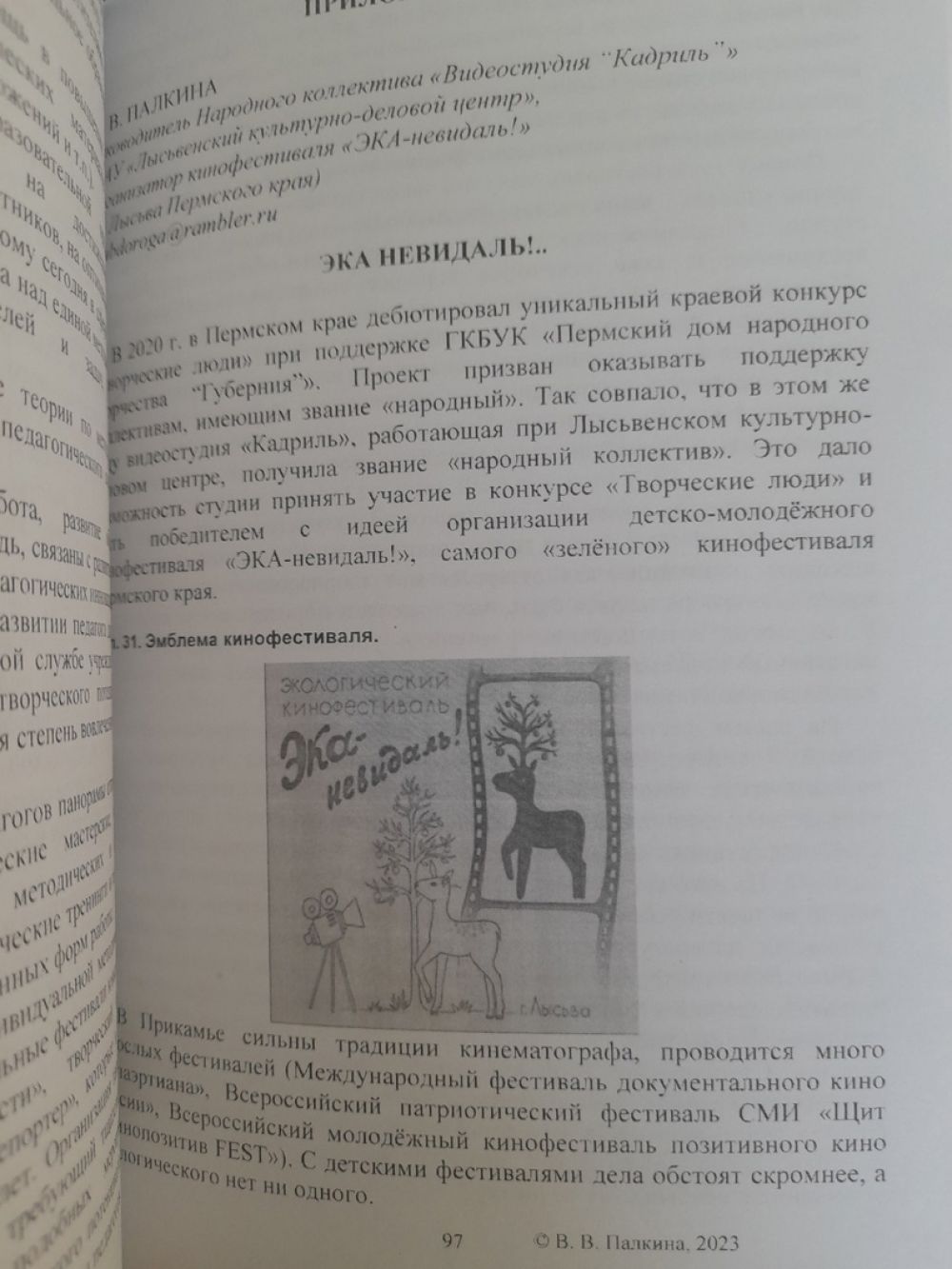 В мае на адрес видеостудии «Кадриль» пришла долгожданная посылка со сборником научных материалов, где мы с радостью обнаружили свою публикацию о лысьвенском кинофестиале «ЭКА-невидаль!». Теперь о нашем фестивале прочтут кинопедагоги во многих уголках России.