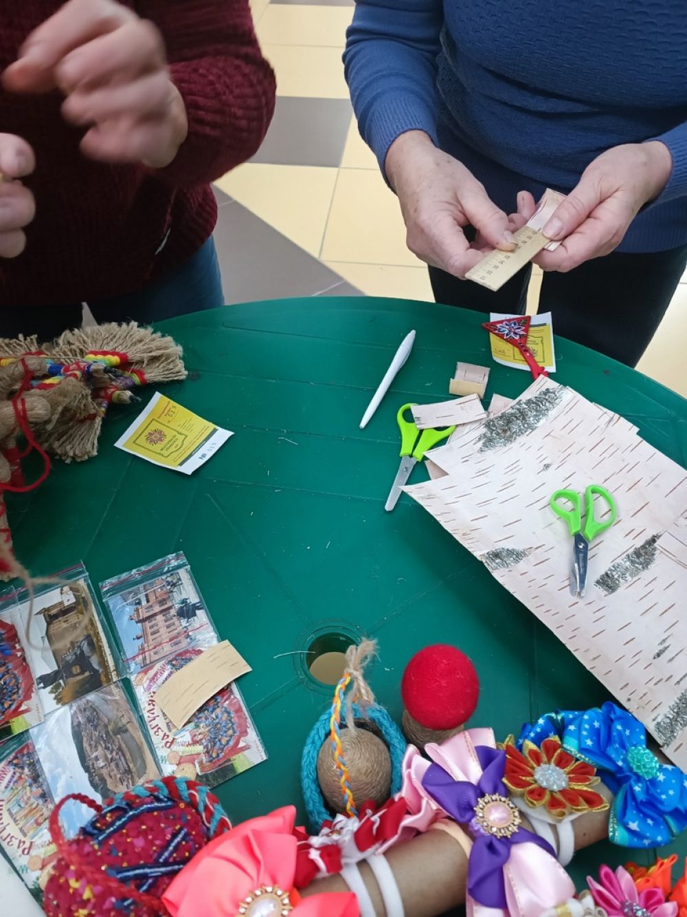 На память землякам остались сувениры, которые они сделали своими руками: оберег из бересты «Шаркунок», брошь «Роза», выполненная в технике валяния, салфетки украшенные набойками по ткани, глиняная бляшка «Медведь в жертвенной позе» и, конечно, сувениры с Обвинской росписью.