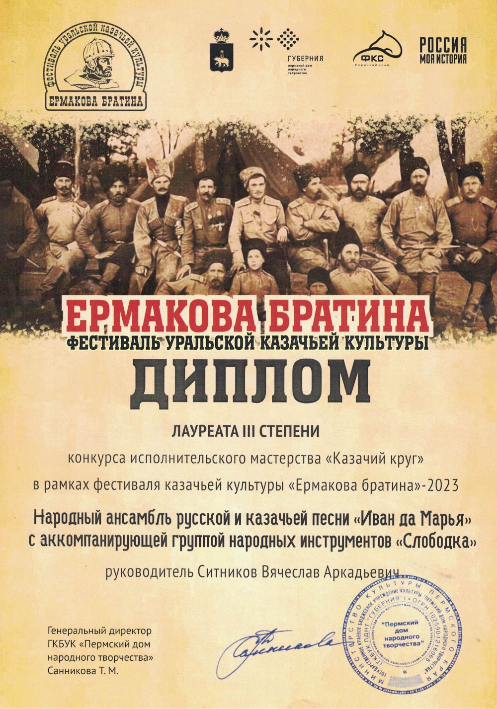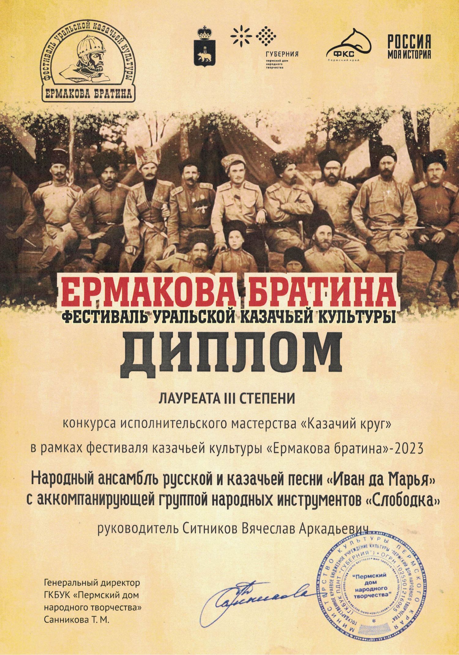 Во второй половине дня состоялся выезд участников «Ермаковой братины» в конно-спортивный комплекс Пермского края. В рамках фестиваля прошёл концерт фольклорного ансамбля старинной казачьей песни «Вольница», первенство спортивных казачьих объединений, квест-игра и экскурсии по конно-спортивному комплексу с катанием на лошадях, конкурс исполнительского искусства творческих коллективов Пермского края «Казачий круг», в котором приняли участие Народный ансамбль русской и казачьей песни «Иван да Марья» с аккомпанирующей группой народных инструментов «Слободка» (руководитель В.А. Ситников). По итогам конкурса наш коллектив признан лауреатом III степени.