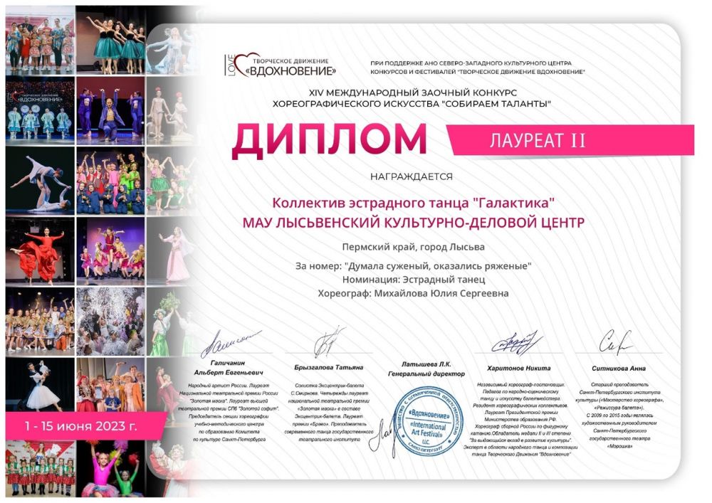 Коллектив эстрадного танца «Галактика» принял участие в IV Международном заочном конкурсе хореографического искусства «Собираем таланты» творческого движения «Вдохновение» с номером «Думала суженый, оказались ряженые» и получил диплом Лауреата 2 степени!!!