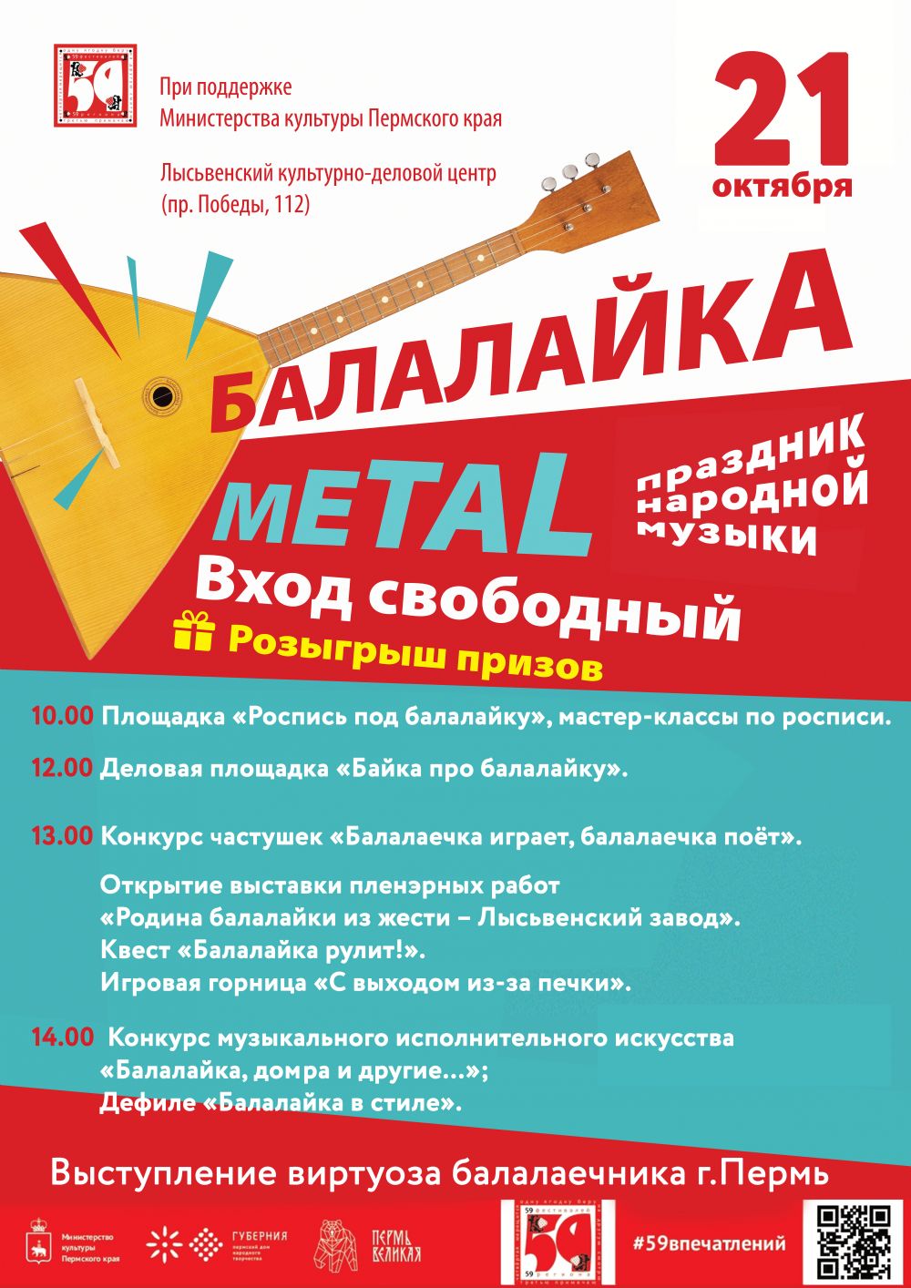 21 октября 2023г. в Лысьвенском культурно-деловом центре состоится традиционный Праздник народной музыки «Балалайка-metal» при поддержке Министерства культуры Пермского края, ПДНТ «Губерния» в рамках краевого проекта «59 фестивалей 59 региона». Всем гостям найдется дело по душе: квест, мастер-классы, живая музыка. Для тех, кто любит участвовыать и побеждать конкурсы Праздника:«Роспись под балалайку» (декоративно-прикладное творчество), «Байки про балалайку» (конкурс творческих работ — эссе), «Балалаечка играет, балалаечка поет» (конкурсе частушек), «Балалайка, домра и другие…». (исполнительское искусство)