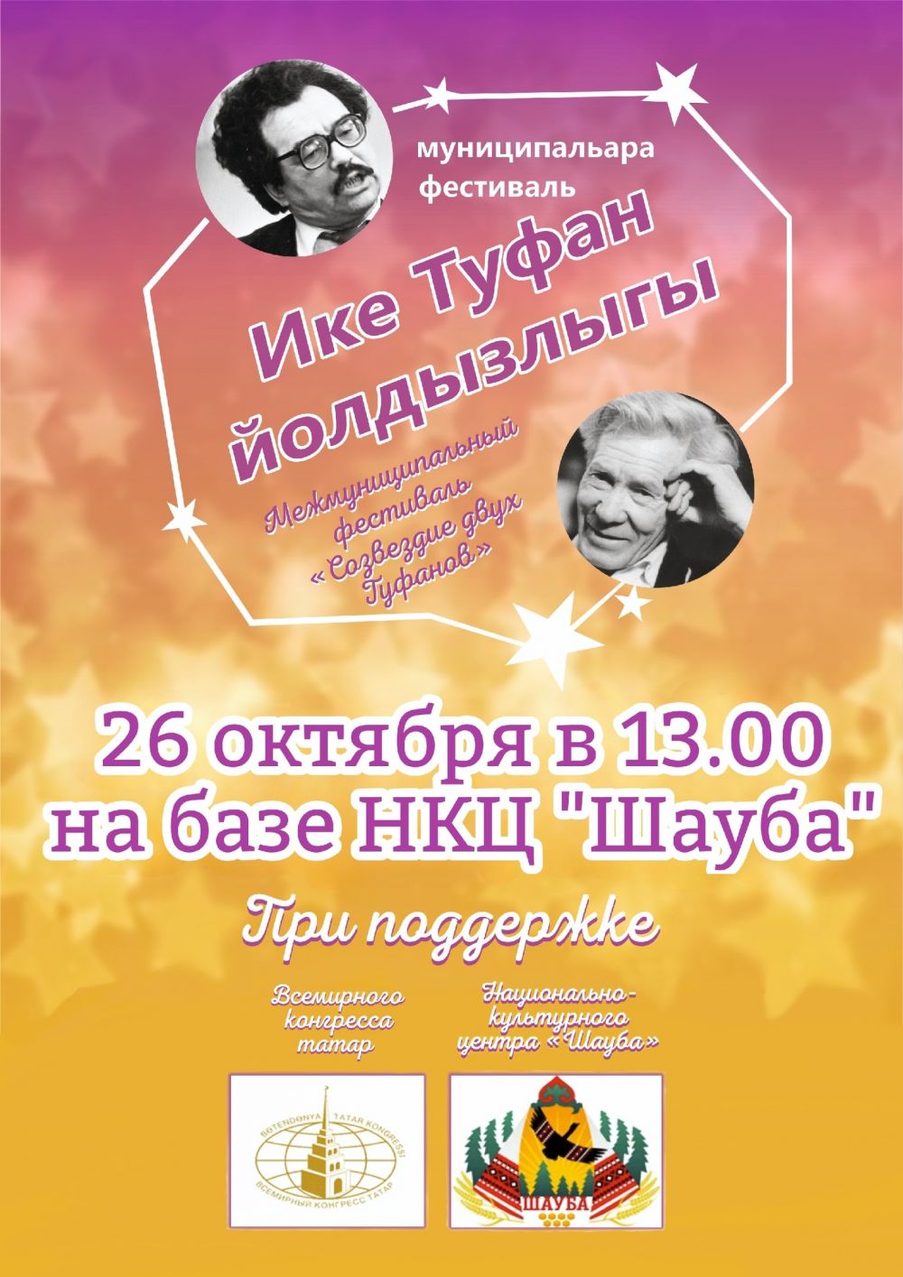 Приглашаем потенциальных участников на Межмуниципальный фестиваль «Ике Туфан йолдызлыгы», в рамках которого пройдут конкурсы поэтов-любителей, драматических кружков, любителей художественного слова и татарской песни.