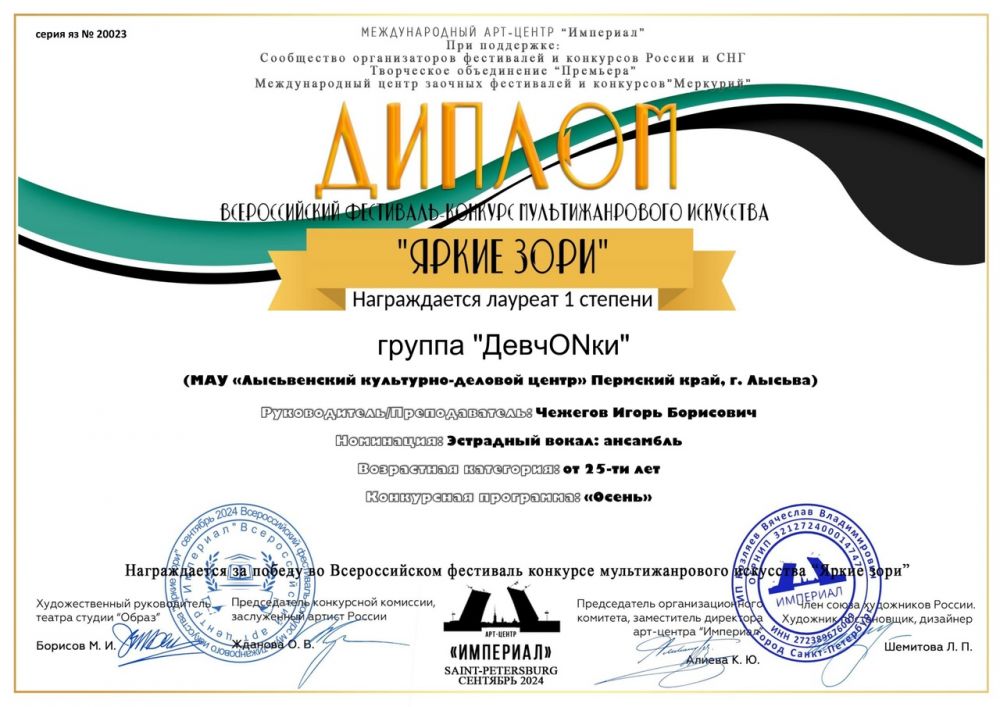Группа «ДевчONки» (руководитель Игорь Борисович Чежегов) завоевала диплом Лауреата I степени на Всероссийском фестивале — конкурсе мультижанрового искусства «Яркие зори».